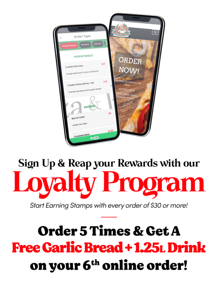 - 2 FAMILY PIZZA SPECIAL + GB$452 Family Size Pizzas and a Garlic Bread
